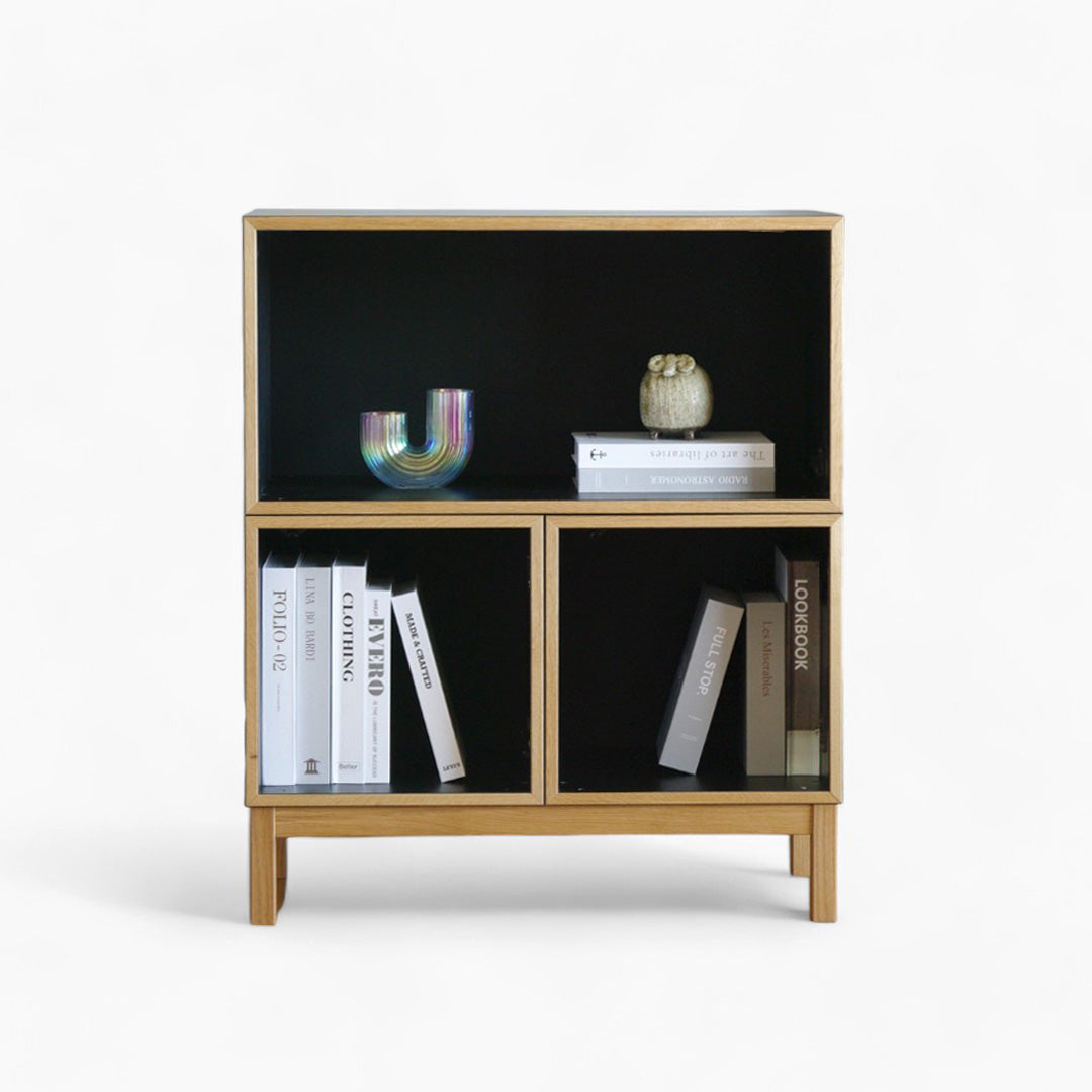 下段に扉を付けると、見せたくないアイテムをすっきりと隠せます。上段にはワイドモジュールボックスを使用したオープンタイプの収納スペースを確保。お気に入りの本やインテリアアイテムを飾って、魅せる収納としてお使いいただけます。
